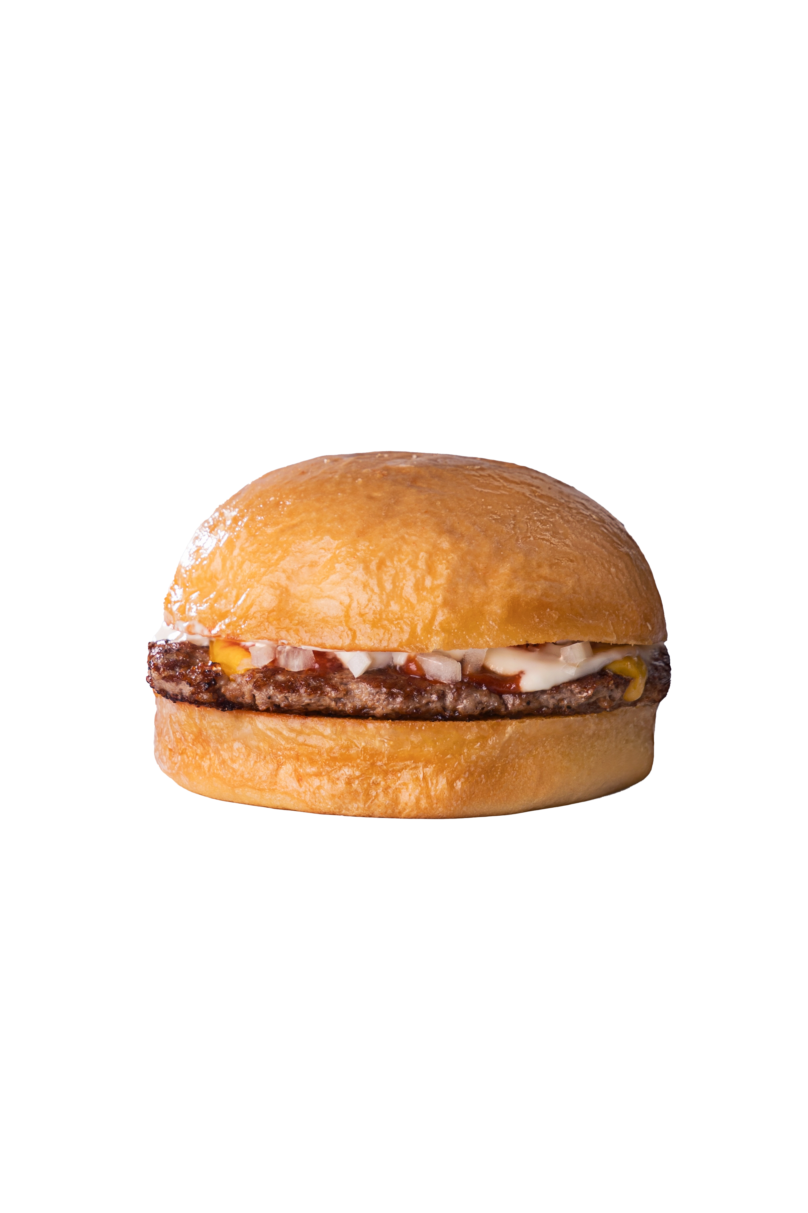Pan de papa, un medallón de carne, doble feta de queso cheddar, mayonesa, ketchup y cebolla