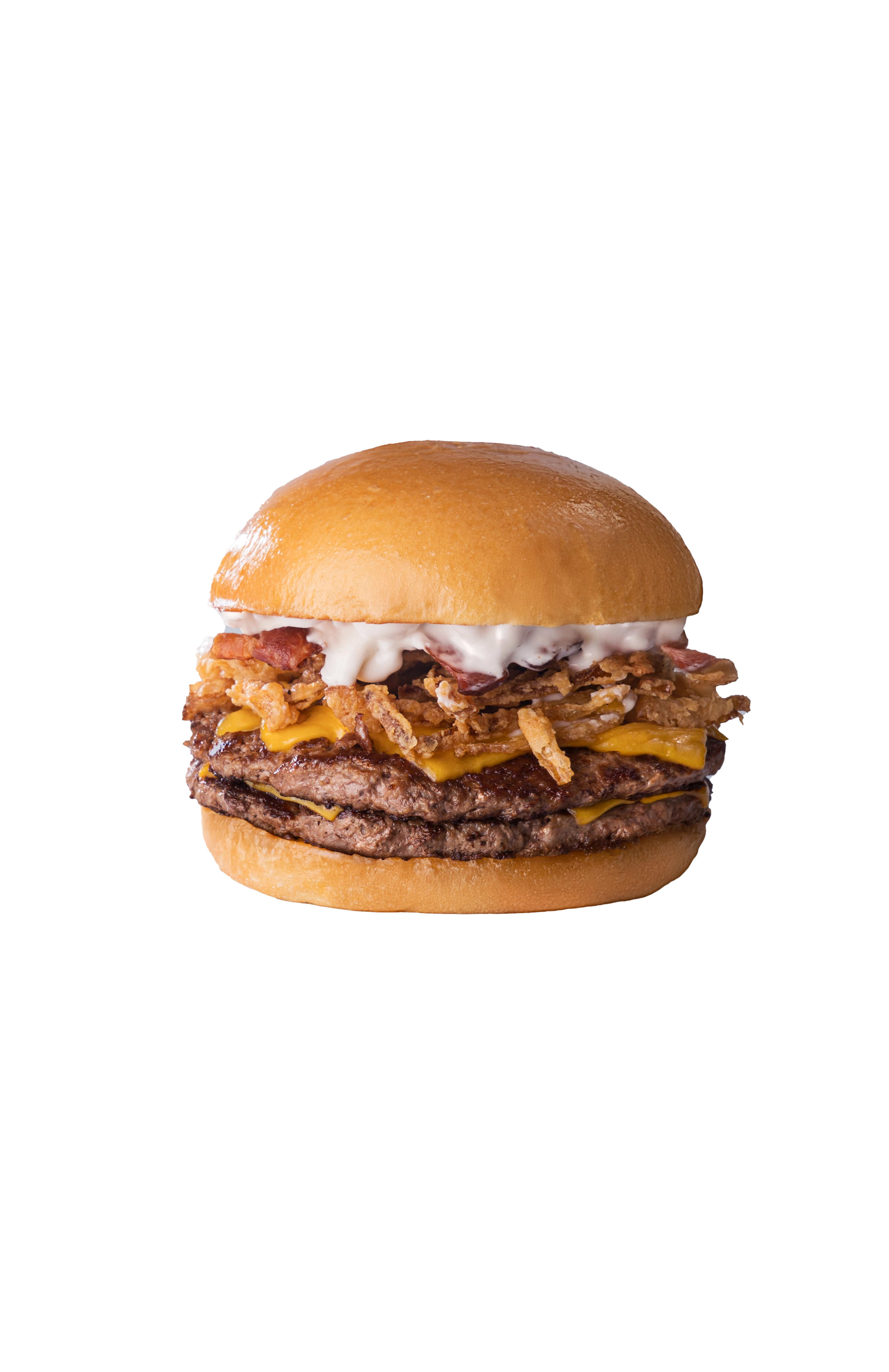 Pan de papa, doble medallón de carne, cuádruple feta de queso cheddar, bacon, cebolla crispy y alioli