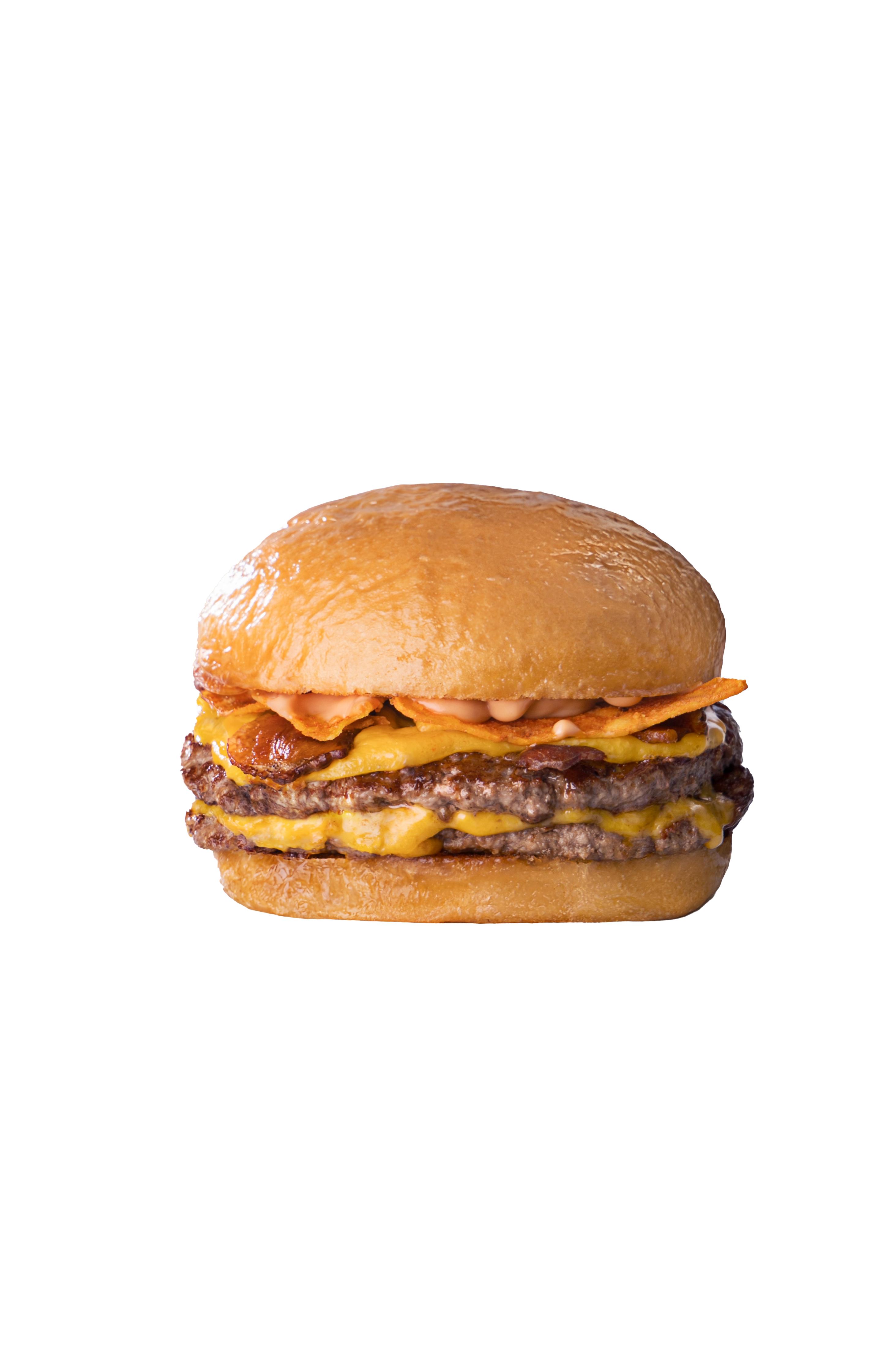 Pan de papa, doble carne, cuádruple feta de queso cheddar, nachos, bacon y aderezo eddie
